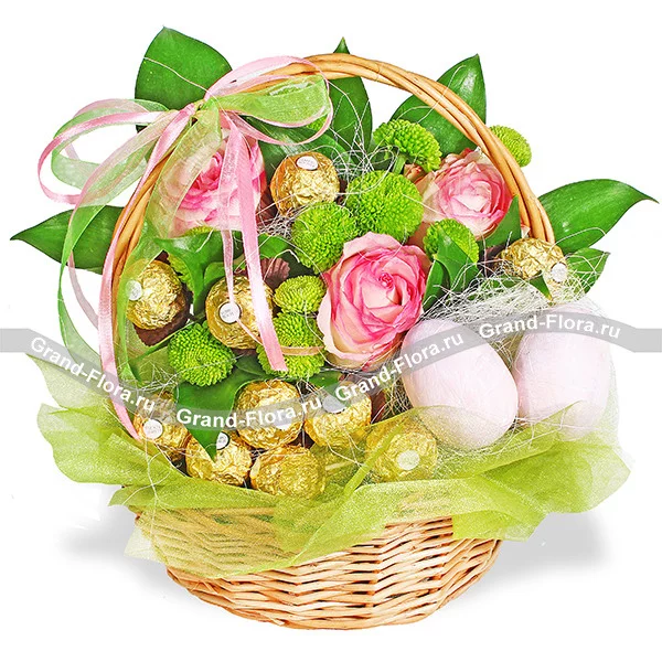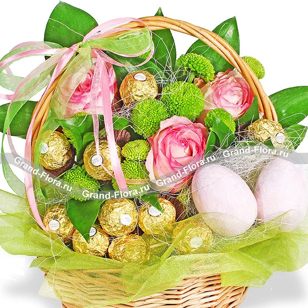 Стандартный: роза розовая - 3 шт., хризантема кустовая зеленая (сантини) - 2 шт., рускус - 2 шт., корзина средняя, фетр зеленый, оазис, яйца (декоративные) - 2 шт., бант розово-зеленый, конфеты "Ferrero Rocher".